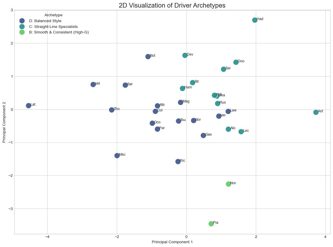 We can see in the above plot that the rookies and new drivers are classified into "Straight-Line Specialists" while the more experienced drivers fall in the "Balanced Style". Norris and Piastri, who currently have the best cars on the grid are in one cluster - "Smooth and Consistent". This is in line with what we see in the actual sport today.